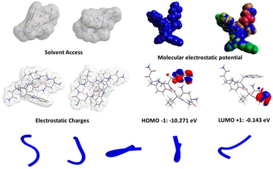 The molecular characteristics of the octanol–water partition coefficient (logP), the ΔGAP energy (ΔGapE), and hence the potential of ionization (I), were all indirectly related to biological activity, according to the models. However, the energy of the HOMO orbital (EHOMO), overall absolute charge, and Ghose–Crippen molar refractivity (AMR) are descriptors that were directly associated with the activity and affinity of the peptide. This was likely due to the peptides’ electron-rich side-chain residues, which were related to high HOMO properties (Figure 6).