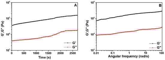 Oscillatory (A) time-sweep and (B) frequency-sweep measurements of the pentapeptide hydrogel (2% w/v) at a constant frequency of 1 Hz and strain of 0.1% performed at 25 °C.
