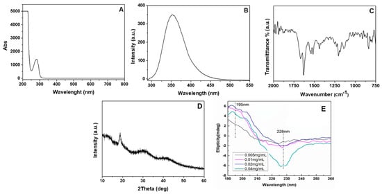 (A) UV adsorption and (B) fluorescence spectra of the pentapeptide hydrogel (0.02% w/v) in water. (C) FTIR and (D) XRD diffractogram of the pentapeptide hydrogel. (E) CD spectra of the pentapeptide at different concentrations in double-distilled water at 25 °C.