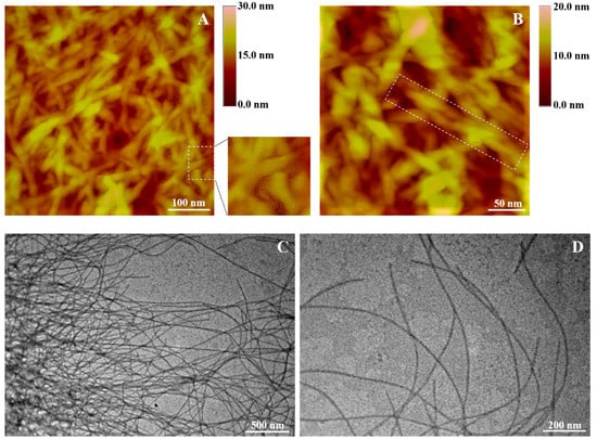 (A,B) AFM images and (C,D) TEM micrographs of the NGIWY-amide pentapeptide hydrogel prepared at 2% w/v in Milli-Q water.
