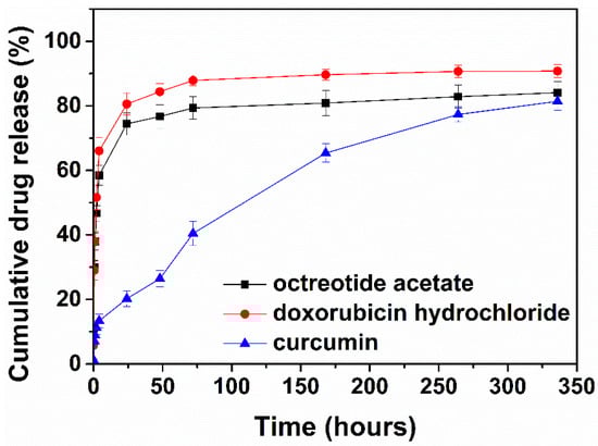 In vitro release profiles of octreotide acetate, doxorubicin hydrochloride, and curcumin from the pentapeptide in PBS pH 7.4 (in the presence of Tween 80 0.1% for curcumin) at 37 °C (n = 3, ±S.D.).