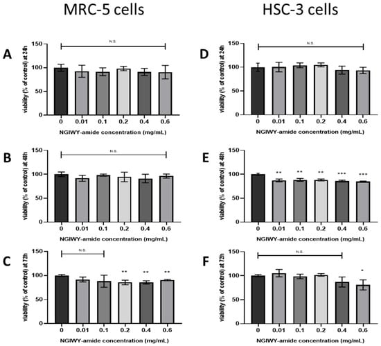 In order to detect the cytotoxicity of NGIWY amide, MRC5 and HSC3 cells were allowed to grow in the presence of different concentrations of NGIWY for 24 h, 48 h, and 72 h. The results of cell viability by the Cell Counting Kit-8 (CCK-8) assay revealed that a low concentration of NGIWY (≤0.6 mg/mL) had no effect on the viability of MRC5 and HSC3 cells even after 72 h exposure (Figure 11). Additionally, no significant number of dead cells was observed to occur in cultures exposed to the treatments mentioned above as compared to control untreated ones (data not shown). Based on these results of the cell toxicity evaluation, NGIWY amide concentrations at ≤0.6 mg/mL were chosen for further experiments.