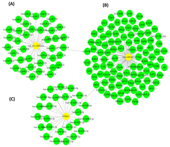Computationally determined hsa-circ-0000221 ceRNA network. The network was constructed using Cytoscape software (Version 3.5.1) and shows the (A) predicted miRNAs targeted by hsa-circ-0000221, (B) the mRNAs targeted by miRNA hsa-mir-661, and (C) the network of miRNAs regulating PTPN11. The lengths of edges in this network correspond to the significance of the interaction between network nodes.