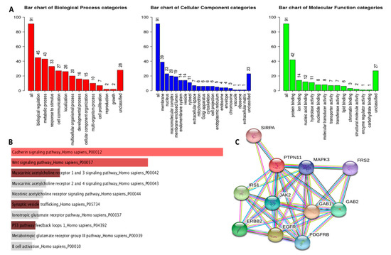 Gene ontology prediction for the hsa-circ-0000221 ceRNA network. (A) GOSlim ontology prediction summary for top 100 mRNA targets of hsa-mir-661 as predicted by the WebGestalt server. The three bar charts represent the main categories of gene ontology including biological process (red), cellular component (blue), and molecular function (green). (B) Significant Panther pathways predicted in which mRNA targets of hsa-mir-661 were enriched, as predicted using Enrichr. (C) STRING database network of PTPN11 significant protein–protein interactions.