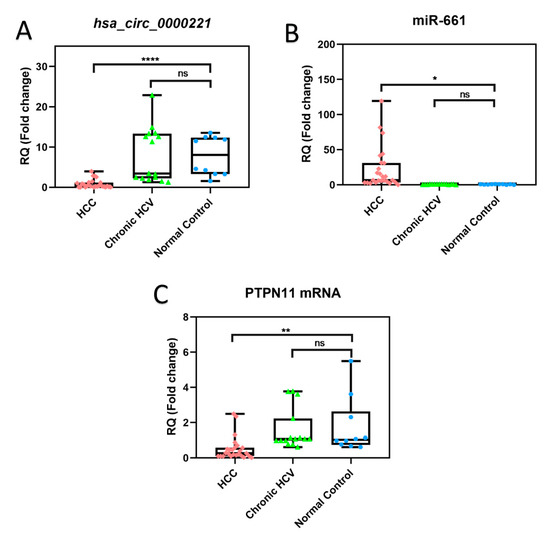 Expression of serum hsa-circ-0000221, miR-661, and PTPN 11 mRNA as determined by qRT-PCR in HCC, chronic HCV, and healthy individuals. The boxplots show the expression of serum (A) hsa-circ-0000221, (B) miR-661, and (C) PTPN11 mRNA among three patient groups: HCC, chronic HCV, and normal control. Individual data points represent individual patients in each group, while error bars indicate SD. Statistics were performed using Student’s unpaired t-test; **** p ≤ 0.0001, ** p ≤ 0.01, * 0.01< p ≤ 0.05, and ns, p > 0.05.