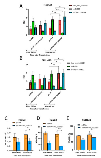Effect of hsa_circ_0000221 overexpression in HepG2 and SNU449 cells. hsa_circ_0000221, miR-661, and PTPN 11 mRNA were quantified by qRT-PCR 1 and 2 days after transfection of either pcDNA-CIRC-0000221 or control vector in (A) HepG2 and (B) SNU449 cell lines. Data for each gene were normalized to their counterparts in cells at 0 h. (C) Cell count in HepG2 cells, and cellular viability in (D) HepG2 and (E) SNU449 cells were measured 1 and 2 days after transfection. Error bars represent SD. Statistics were performed using Student’s unpaired t-test; ** p ≤ 0.01, * 0.01 < p ≤ 0.05, and ns, p > 0.05.