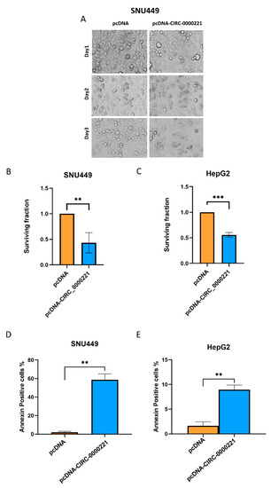 To investigate whether the expression of hsa-circ-0000221 is inducing necrotic or apoptotic cell death, SNU449 cells were transfected (transfection efficiency was more than 50%) with hsa-circ-0000221 expressing plasmid or control. Cells expressing the circRNA showed cellular death, which was detected by rounding cells that detach plastic as shown by regular microscopy (Figure 5A). Furthermore, exogenous expression of this gene also significantly reduced the colony-forming ability of the SNU449 and HepG2 cells as quantified in Figure 5B,C. Representative images of the assay are shown in Supplementary Figure S4. Lastly, the number of annexin V-stained cells was significantly enhanced by transient transfection with hsa-circ-0000221 in both cell lines, indicating that the observed cell death is due to apoptosis (Figure 5D,E).