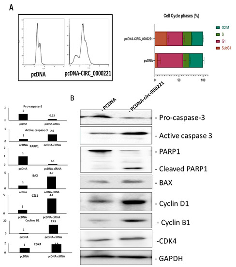To further investigate the mechanism through which hsa-circ-0000221 affects the viability and induces apoptosis in HCC, we studied the cell cycle after transfection with hsa-circ-0000221-expressing vector or empty vector. The DNA content study indicates that SNU449 cells overexpressing hsa-circ-0000221 are relatively accumulated in the G1 phase, and those that are released from the G2/M phase hardly re-enter the cell cycle and may face cell death as indicated by the different population in the cytograph (Figure 6A left) and the quantification performed for all repeats (Figure 6A right). The debris peak indicating dead cells appeared as a sub-G1 peak only in those cells overexpressing the circRNA but not in the mock-treated cells.