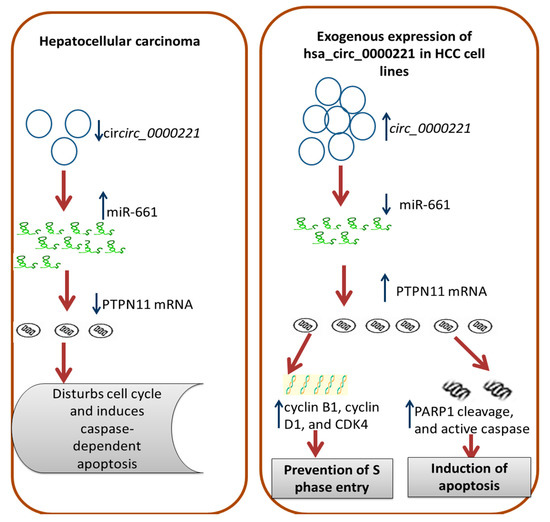 According to our findings, miR-661 has an oncogenic function in HCC as it targets PTPN11; depletion of miR-661 may give the chance for PTPN11 transcript to increase and subsequently inhibit cellular proliferation in HCC. Our results proved that miR-661 could be depleted indirectly via upregulation or overexpression of hsa-circ-0000221 in HCC cells. Furthermore, our finding indicates that miR-661 depletion and the subsequent increase in PTPN11 are a consequence of hsa-circ-0000221 overexpression in vitro, which is associated with retardation of the cellular viability and/or apoptosis induction.