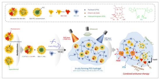Paclitaxel (PTX) was obtained from JW Pharmaceutical Corporation (Dangjin, South Korea). Indocyanine green (ICG) and icosafluoro-15-crown-5-ether (PFC) were purchased from Tokyo Chemical Industry Co., LTD. (Tokyo, Japan). Chlorin e6 (Ce6) was supplied by Frontier Scientific (Salt Lake City, UT, USA). Bovine serum albumin (BSA) and 2-iminothiolane (2-IT; Traut’s reagent) were purchased from Sigma-Aldrich (St. Louis, MO, USA). Four-arm polyethylene glycol maleimide (4-arm PEG-MAL; Mw 20 kDa) was purchased from NOF Corporation (Tokyo, Japan). The 4T1 breast cancer cells were obtained from the American Type Culture Collection (ATCC; Rockville, MD, USA). LIVE/DEAD™ viability/cytotoxicity assay kits, Singlet Oxygen Sensor Green reagent (SOSG), and CellROX™ Deep Red reagent were purchased from Thermo Fisher Scientific (Waltham, MA, USA). Anti-HIF-1α primary and Alexa Fluor®-488-conjugated goat anti-rabbit secondary antibodies were purchased from Abcam (Cambridge, MA, USA). Trypsin-EDTA and penicillin-streptomycin (P/S) solution were purchased from Corning (Somerville, NY, USA). Dulbecco’s Modified Eagle Medium (DMEM) and fetal bovine serum (FBS) were purchased from Capricorn (Ebsdorfergrund, Hesse, Germany). All other reagents were obtained from Sigma-Aldrich unless otherwise indicated.