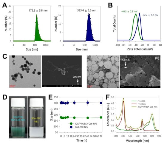 (A) Histograms of particle sizes of ICG/PTX/BSA-Ce6-NPs and BSA-PFC-Nes. (B) Zeta potentials of ICG/PTX/BSA-Ce6-NPs and BSA-PFC-NEs. (C) TEM and FE-SEM images of ICG/PTX/BSA-Ce6-NPs (left: a) and BSA-PFC-NEs (right: b). (D) Photographs showing colloidal solution state for ICG/PTX/BSA-Ce6-NPs and BSA-PFC-NEs. (E) Physical stability of ICG/PTX/BSA-Ce6-NPs and BSA-PFC-NEs based on size changes over 3 days. (F) UV-VIS spectroscopic analyses for free ICG, free Ce6, and ICG/PTX/BSA-Ce6-NPs at 300–900 nm wavelengths.