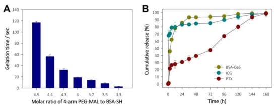 (A) Monitoring of gelation time for in situ-forming PEG hydrogel according to the 4-arm PEG-MAL:BSA-SH molar ratio. (B) Release profiles for BSA-Ce6, ICG, and PTX from ICG/PTX/BSA-Ce6-NPs@Gel.