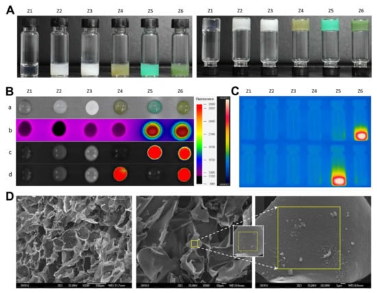 Separately, the various hydrogel formulations (Z1−Z6) had distinct colors, ranging from transparent to milky, khaki green, or dark green, depending on ICG, Ce6, and PFC concentrations (Figure 4A). All formulas gelled easily within ~60 s and did not flow or drop when turned upside-down. As shown in Figure 4B,C, PEG hydrogels containing ICG (Z5 and Z6) produced significant hyperthermia, and those containing both ICG and Ce6 emitted strong fluorescence at the relevant emission wavelengths. The FE-SEM images showed that the PEG hydrogels contained considerable amounts of nanoparticles having sizes of ~150 and >300 nm, presumably corresponding to ICG/PTX/BSA-Ce6-NPs and BSA-PFC-NEs (Figure 4D).