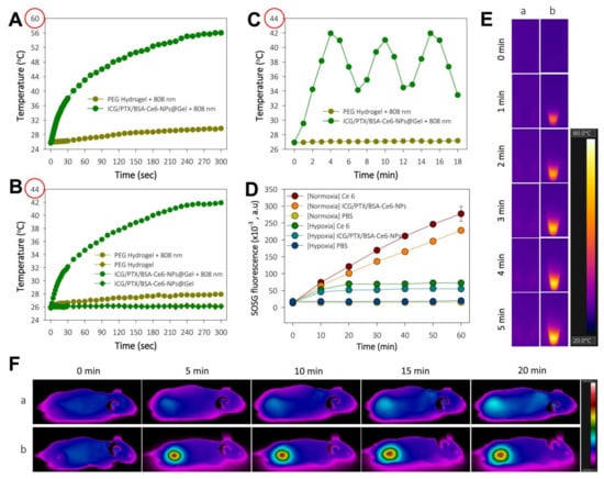 The induction of hyperthermia by ICG/PTX/BSA-Ce6-NPs@Gel when irradiated by the 808 nm laser was evaluated. As shown in Figure 5A,E, the temperature of the ICG/PTX/BSA-Ce6-NPs@Gel quickly increased from 26 to 56 °C within 5 min of initiation of 808-nm laser irradiation (1.2 W/cm2), whereas the temperature of the plain PEG hydrogel increased by only 3 °C. However, the temperature of ICG/PTX/BSA-Ce6-NPs@Gel increased to 42 °C in response to 808 nm laser irradiation (0.8 W/cm2) (Figure 5B). As shown in Figure 5C, when 808-nm laser irradiation (0.8 W/cm2) was applied intermittently in 3 min on/off cycles, the gel temperature reached ~41 °C after 30 s irradiation and returned to the basal temperature before additional irradiation. Separately, ICG/PTX/BSA-Ce6-NPs were clearly able to induce singlet oxygen generation, as evaluated by the fluorescence intensity caused by SOSG. Overall, the SOSG fluorescence appeared to increase with the duration of irradiation (Figure 5D). Singlet oxygen generation by ICG/PTX/BSA-Ce6-NPs appeared comparable to that of free Ce6, and much less singlet oxygen was generated under hypoxic conditions than under normoxic conditions. Furthermore, the tumor temperature of 4T1 tumor-bearing mouse treated with ICG/PTX/BSA-Ce6-NPs@Gelplus 808-nm laser irradiation (0.8 W/cm2) maintained around ~41 °C for 20 min, whereas that of mouse treated with the naïve PEG hydrogel at the same condition did not significantly increase (Figure 5F).