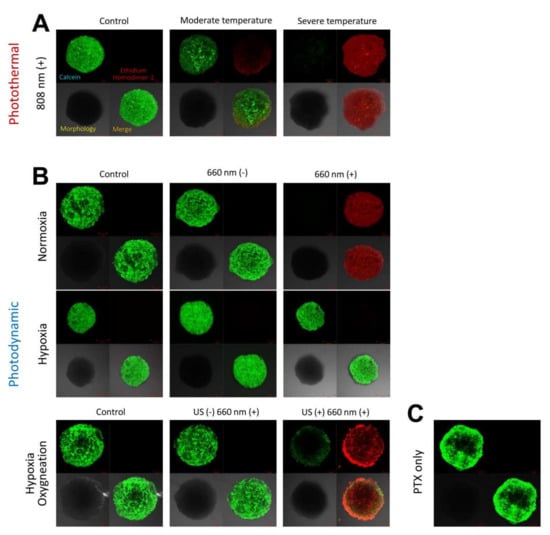 Three-dimensional culture of 4T1 cells to form spheroids was performed by a slight modification of previously described methods [2,26,30]. LIVE/DEAD™ viability/cytotoxicity kits were used to visualize the death and viability of the 4T1 cells. Briefly, the 4T1 cells were cultured in DMEM media containing 10% (v/v) fetal bovine serum and 1% penicillin/streptomycin in a 5% CO2, 95% RH incubator at 37 °C. A 100 μL sample containing 4000 cells was seeded into each well of V-bottom cell plates (Shimadzu, Kyoto, Japan) designed to induce the formation of 3D multicellular spheroids. The 4T1 cell spheroids were then allowed to become established over three days before further experiments. The spheroids previously incubated with ICG/PTX/BSA-Ce6-NPs@Gel for 6 h were assigned to groups with or without laser irradiation (808 nm for 10 min or 660 nm for 60 min, respectively) and/or with or without an ultrasound (US) scan (US for 15 min) according to the previously described oxygen conditions (normoxic, hypoxic or oxygenated). The degree of hyperthermia induced was determined irradiation at 0.8 and 1.2 W/cm2 for mild and severe hyperthermia, respectively, where the target temperatures were set to 41–42 °C or >48 °C, respectively. The hypoxic condition was precisely achieved by incubating the hypoxic chamber in a hypoxic gas stream (5% CO2:95% N2 on a volume basis). The plates for samples were washed three times with DPBS, and the medium was replenished with fresh medium before laser or ultrasound treatment. After laser or ultrasound treatment, the cells were stained with Calcein-AM (for live cells) and Ethidium Homodimer-1 (for dead cells). Subsequently, the stained cells were observed by CLSM (excitation/emission wavelengths of 494/517 nm for Calcein-AM and 528/617 nm for Ethidium Homodimer-1, respectively).