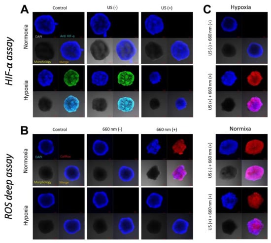(A) CLSM images of 4T1 cell spheroids incubated with ICG/PTX/BSA-Ce6-NPs~PFC-NEs@Gel with or without US guidance under normoxic or hypoxic conditions in order to assess consequent HIF-1α production. (B) CLSM images of 4T1 cell spheroids incubated with ICG/PTX/BSA-Ce6-NPs~PFC-NEs@Gel with or without 660 nm laser irradiation under normoxic or hypoxic conditions in order to assess consequent intracellular ROS (singlet oxygen) production. (C) CLSM images of 4T1 cell spheroids incubated with ICG/PTX/BSA-Ce6-NPs~PFC-NEs@Gel with or without US guidance and irradiated with a 660 nm laser under normoxic or hypoxic conditions in order to assess consequent intracellular ROS production.
