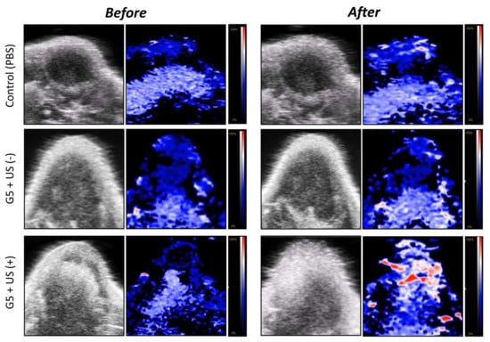 The accumulation of oxygen (as HbO2) produced in 4T1 tumors xenografted onto mice was visualized using photoacoustic (PA) analyses with high resolution and deep imaging depth (Figure 9). Groups were designated as either the PBS control or ICG/PTX/BSA-Ce6-NPs~PFC-NEs@Gel (G5 formula) with or without a US scan. The PEG hydrogel group (G5) with US scan under mild heat (41−42 °C) clearly displayed the greatest oxygen distribution (red signal) throughout the tumors on PA imaging: the HbO2 percentage was measured as 25.0% to 42.7% at before and after US, respectively, compared with the negligible HbO2-level changes (around 23.1%~29.6%) for PBS control and G5 + US(−). This result demonstrated that our ICG/PTX/BSA-Ce6-NPs~PFC-NEs@Gel had a significant ability to supply oxygen to the hypoxic breast tumors.