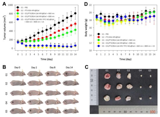 The antitumor effects of ICG/PTX/BSA-Ce6-NPs~PFC-NEs@Gel were evaluated in 4T1 tumor-bearing mice. The tumor volumes for each group of mice were measured for 14 days after treatment (Figure 10A): the final tumor volumes for the G1 to G5 groups were 805.9 ± 138.5, 565.5 ± 41.6, 424.2 ± 90.6, 47.7 ± 11.6, and 63.4 ± 13.0 mm3, respectively. The G4 formulation with severe heat-induced regression of almost the entire tumor in each xenografted mouse due to the hyperthermal effect. In addition, the G5 formulation (with oxygen provided by the US scan and mild heat induced by the 808 nm laser and singlet oxygen generated by 660 nm laser irradiation) noticeably suppressed the tumors as compared to the G3 group that did not receive oxygen induced by the US scan. The body weight of the mice in the five treatment groups was maintained without significant change over 14 days, indicating that all mice were well cared for without deleterious effects during the entire therapy period (Figure 10E).