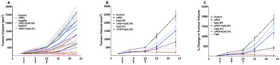 CpG-ODN is being explored clinically for use as a vaccine adjuvant in combination with ICIs, chemo, or radiotherapy for various cancer types (metastatic prostate cancer, melanoma, or recurrent head and neck cancer) [25,27,28,29]. However, accurate assessment of immune treatment response in a clinical setting is complex [30,31]. Typically, radiological measures of tumour volume are employed to assess response to treatment in solid tumours; however, new response types associated with immune therapies, such as pseudoprogression, hyperprogression, or a dissociative response may not be accurately interpreted with these conventional response criteria [32,33].
