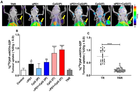 In-vivo PET imaging with [18F]AlF-mNOTA-GZP revealed that tumours could be visualised above background, and the radiotracer uptake was found to be heterogeneous across different treatment arms (Figure 2A). [18F]AlF-mNOTA-GZP was able to stratify responders from non-responders across different therapy arms (Table 1 and Figure 2B,C). In general, low [18F]AlF-mNOTA-GZP tumour uptake was observed in the control group (0.20 ± 0.06% ID/g, n = 10) and TNRs (0.20 ± 0.03% ID/g, n = 10). Significantly higher uptake was observed in all TRs from both monotherapy αPD1 (0.42 ± 0.10% ID/g, * p < 0.05, n = 7) and CpG-ODN (IT) (0.82 ± 0.21% ID/g, **** p < 0.0001, n = 6) and combination therapy αPD1 + CpG-ODN (IP) (0.49 ± 0.08% ID/g, ** p < 0.01, n = 5) and αPD1 + CpG-ODN (IT) (0.95 ± 0.12% ID/g, **** p < 0.0001, n = 6) cohorts (Figure 2B). Furthermore, no significant uptake was observed in the CpG-ODN (IP) alone group compared to the TNR group (0.26 ± 0.17 vs. 0.20 ± 0.03% ID/g, p = 0.779, n = 10).
