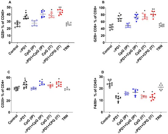Similarly, a significant increase in the GZB+CD8+ cells was observed in monotherapy αPD1 (69.16 ± 7.55, * p < 0.05), CpG-ODN (IT) (73.87 ± 6.70, * p < 0.05) and in combination therapy αPD1 + CpG-ODN (IP) (72.99 ± 7.95, * p < 0.05) and αPD1 + CpG-ODN (IT) (80.83 ± 7.62, ** p < 0.01). Again, no significant changes were noticed in the GZB+CD8+ cells numbers in the CpG-ODN (IP)-treated mice in contrast to TNRs group (49.04 ± 5.45 vs. 49.76 ± 4.19, p > 0.05) (Figure 3B). In addition to CD8+ cells, we noticed a profound increase in the CD25+CD4+ cells in the monotherapy αPD1 (47.20 ± 5.05, * p < 0.05), CpG-ODN (IT) (45.52 ± 2.00, * p < 0.05) and combination therapy αPD1 + CpG-ODN (IP) (49.60 ± 2.99, * p < 0.05) and αPD1 + CpG-ODN (IT) (48.25 ± 3.53, * p < 0.0) responders. Again, the CpG-ODN (IP) monotherapy group did not show any significant changes in the CD25+CD4+ cell population when compared to the TNR group (40.87 ± 1.70 vs. 39.96 ± 2.01, p > 0.05) (Figure 3C).