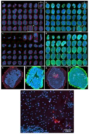 Figure 5a–d shows the mRNA delivery and eGFP expression yielded by this delivery method. The Cy5 signal is only faintly visible in the last (i.e., deepest) skin sections. Figure 5 presents details of sections 32 and 36 for Dermojet® 1-head jet injection and Dermojet® 3-head jet injection, respectively. It appears that the use of the triple-headed jet injector results in a broader delivery of the mRNA, allowing it to reach the sample periphery. However, these different delivery modalities result in no change in the expression pattern of the eGFP protein: as for the intradermal injections, it seems to be expressed away from the injection site by epidermal keratinocytes, by epithelial cells in appendageal structures as PSU, and sweat glands, vascular tissues, and weakly dermal fibroblasts (Figure 5).