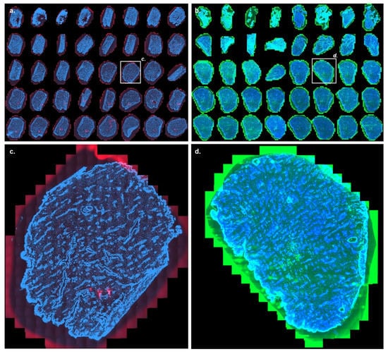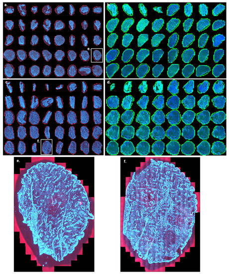DAPI staining was used to indicate indirectly the histological region of skin: the arrangement of cell nuclei and their density allowed the identification of the heterogeneous skin layers. H&E staining was used to confirm the different histological skin structures (Figure 1c–e). Figure 1c,d show typical histological patterns found in horizontal sections of skin. FM observations indicate that stratum corneum appears as lightly stained threads (Figure 1c), while viable epidermis can be easily identified by the dense packing of cell nuclei of keratinocytes in DAPI stained samples and hematoxylin-rich regions in the H&E staining. Skin is a heterogeneous organ where every layer is invaginated into each other: epithelial cells co-exist with dermal tissue in several slices, separated by the dermo-epithelial junction (Figure 1c,d). This papillary dermis is characterized by the sparser distribution of the cell nuclei from fibroblasts. In the deeper reticular dermis, epithelial cells can be observed in the form of the lining of pilosebaceous units (PSU) and sweat ducts (Figure 1e). The reticular dermis also presents groups of hematoxylin stained cells corresponding to the vascular tissue [49]. In skin, blood vessels are often accompanied by the lymphatic network [50] (Figure 1e). In subsequent observations, only DAPI staining was used to identify histological skin structures.