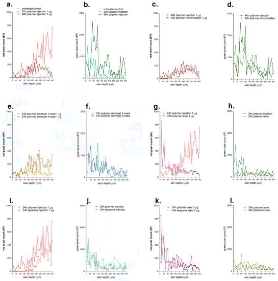To better compare the different delivery techniques and to provide more quantitative data about the mRNA delivery and eGFP expression, microscopic pictures were processed to enable specific pixel counting of Cy5 signal (red) and GPF signal (green) in every skin section. Figure 7 shows pixel counts as a function of skin depth. This semi-quantitative method appeared to be valid since the untreated skin resulted in low pixel count (due to background noise) for both Cy5 and eGFP signals (Figure 7a,b). In agreement with visual evaluation, 24 h after the intradermal injection, Cy5 labeled mRNA signal increased with skin depth, reaching a maximum in the last section. 48 h post-injection this signal started to decrease in the dermal layers (below 160 µm; Figure 7a,b). The corresponding eGFP expression estimated by pixel counting points to a high expression in epidermal layers at 24 h and a maximal expression at 48 h between 40 and 120 µm of skin depth (viable epidermis). This again confirms the visual observations made previously. The microneedle-mediated injection yielded similar delivery and expression profiles to the intradermal injection (Figure 7c,d). Both jet injector delivery techniques yielded similar mRNA delivery and eGFP expression (Figure 7e,f). Fractional laser ablation delivered Cy5 labeled mRNA to superficial layers of epidermis mainly; however, eGFP expression was decreased in comparison with the ID injection (Figure 7g,h). The use of liposomal transfection agent did not produce any difference in Cy5 labeled mRNA delivery nor eGFP expression, regardless of the delivery technique used, apart from a slightly deeper signal after ID injection, probably due to a different injection depth (Figure 7i–l).