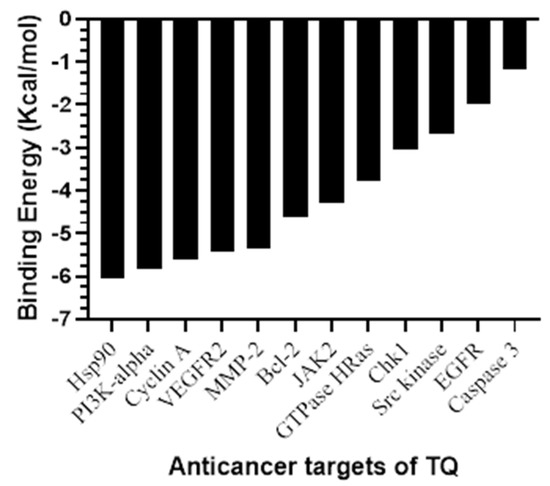 A bar plot of molecular docking─predicted binding energy (in kcal/mol) of TQ against potential anticancer drug targets.