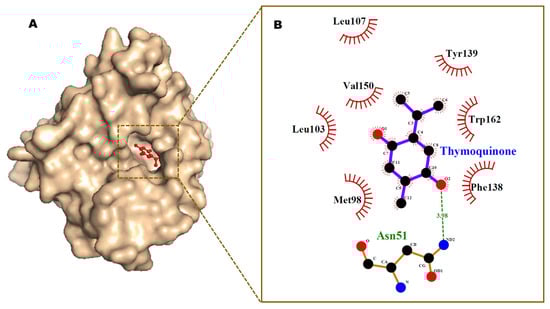 The results of AutoDock 4.2 predicted affinity of TQ against 12 potential anticancer drug targets are presented in Figure 1. The binding energy ranged from −6.05 kcal/mol for Hsp90 protein to −1.19 kcal/mol against caspase-3. Appreciable affinity was observed, with PI3K-alpha, cyclin A, VEGFR2, and MMP-2 targets showing binding energy in the range of −5.32 to −5.82 kcal/mol (Table S1). The intermolecular interactions of docked TQ with heat shock protein-90 (Hsp90) and phosphatidylinositol-3 kinase (PI3K) alpha are portrayed in Figure 2 and Figure 3, respectively. In Hsp90 protein, docked TQ is surrounded by amino acid residues, such as Asn51, Met98, Leu103, Leu107, Phe138, Tyr139, Val150, and Trp162. The hydrophobic cleft is formed by all of these residues except Asn51, which acts as a donor of the hydrogen bond for TQ. The binding pocket of PI3K-alpha is constituted by Gln630, Ile633, His670, Met811, Leu814, Gln815, Arg818, Tyr836, and Cys838. Among these, His670 contributed a polar hydrogen bond with the TQ while the rest of the amino acid residues participated in hydrophobic interactions. In addition, docked TQ aligned itself within the Hsp90 binding pocket corresponding to the bound inhibitor, 5-(3,4-dichloro-phenoxy)-benzene-1,3-diol (Figure 4).