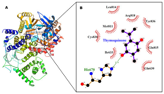 Several toxicity parameters, such as hepatotoxicity, carcinogenicity, cytotoxicity, immunotoxicity, mutagenicity, and toxicities associated with stress response and nuclear receptor signaling pathways, were estimated by ProTox-II, which exploits fragment similarity-based cluster cross-validation and machine learning approaches. Thymoquinone was found to be inactive in all of the tested toxicities except mitochondrial membrane potential, a stress response pathway, in which it was found to be active, having a probability score of 0.58 (Table 2. The predicted LD50 of thymoquinone was noted as 2400 mg/kg, ranking V in toxicity class, according to the globally harmonized classification system in which class I represents the most toxic substance whereas class VI is regarded as a non-toxic entity [30,32].