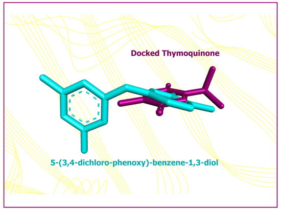 A molecular docking investigation was carried against many pharmacological targets linked to anticancer drug development to acquire an insight into the predictive basis for the probable interaction mechanisms of TQ. To our knowledge, this is the first research to use the AutoDock 4.2 molecular docking technology to characterize the molecular interactions profile of this molecule against multiple drug targets relevant to carcinogenesis. TQ exhibited the highest affinity for the Hsp90 protein, which had a binding energy of −6.05 kcal/mol, and the lowest affinity for the caspase-3 enzyme, demonstrating a binding energy of −1.19 kcal/mol. Hsp90 plays an essential role in oncogenic signaling, making it an intriguing target for cancer treatment. Therefore, inhibition of Hsp90 activity concurrently disrupts various signal transduction pathways that are critical for tumor growth and survival [61]. Molecular docking is a robust computational technique for inferring the intermolecular interactions between ligands and proteins, but because the solvation penalty associated with the binding cannot be accurately assessed [62], further research is needed to justify the approximation of the binding energy. Superimposition of the docked TQ and native co-crystallized inhibitor of the Hsp90 protein, 5-(3,4-dichloro-phenoxy)-benzene-1,3-diol, exhibited a root-mean square deviation of 3.23 Å (Figure 4), which further confirms the potential of TQ-based ligand to be developed as an Hsp90 inhibitor. Research into the TQ’s particular anticancer mode of action as well as lead optimization might be sparked by the current findings.
