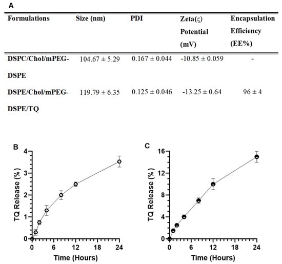 As shown in Figure 5, the DLS data showed that the mean particle size of DSPC/Chol containing PEGylated empty liposomes is 104 nm, while TQ entrapped liposomes were measured to be ~120 nm with <0.2 PDI homogeneity in both types of liposomes. The PDI and zeta potential of empty liposomes were measured as 0.167 and −10.85 mv, respectively. However, the PDI, zeta potential, and entrapment efficiency TQ-Lip were recorded as 0.125, −13.25 mv, and 96%, correspondingly (Figure 5A).