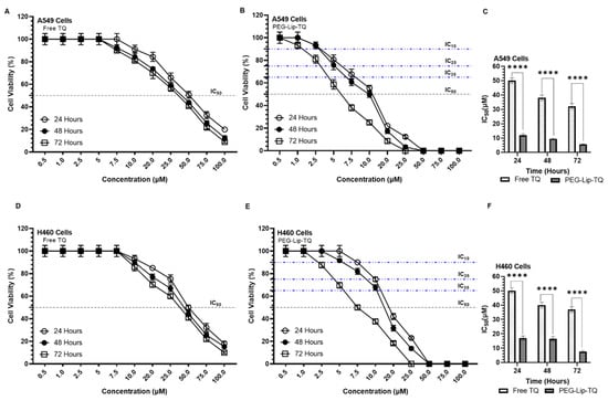 The results from the cell cytotoxicity assays revealed high sensitivity of TQ by PEG-Lip-TQ in comparison to free TQ (Figure 6). The data showed that the IC50 of free TQ was calculated as 50, 38, and 32 μM after 24, 48, and 72 h, respectively, in A549 lung cancer cells. However, the LD50 of Lip-TQ was found to be 12, 9.5, and 5.56 μM correspondingly, showing a significant difference at p < 0.0001 (Figure 6A–C). As depicted in Figure 6D–F, PEG-Lip-TQ was found to be significantly very effective as 17, 16, and 7.5 μM, when IC50 were measured after 24, 48, and 72 h, respectively, while 50, 40, and 37 μM were determined, correspondingly by free TQ. The results clearly indicated the cytotoxic effect of PEG-Lip-TQ as well as its stability as less than 40% and 55% μM concentrations were required to reach to the IC50 in A549 and H460 cells, respectively (Figure 6).