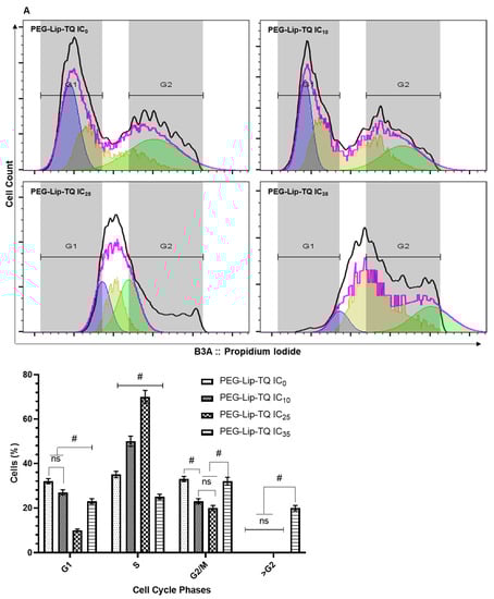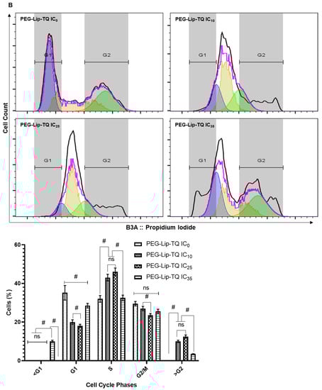 The IC10, IC25, and IC35 of PEG-Lip-TQ were selected to analyze the effect of liposomal formulations of TQ on the cell cycle distribution in A549 and H460 lung cancer cell lines by flow cytometry. The doses were measured as IC10 (3μM), IC25 (5 μM), and IC35 (7.2 μM) in A549, while 5, 6.5, and 10 μM, respectively, in H460 cells. Briefly, 2.5 × 105 cells/well were seeded in the 6-well plates for 24 h, and then treated with selected doses of PEG-Lip-TQ. The cells were harvested, washed with sample buffer, and followed by fixation in 70% ice-cold ethanol in sample buffer overnight. The cells were suspended in the sample buffer containing 50 µg/mL propidium iodide (PI) and 100 µg/mL Ribonuclease A (RNAse A) followed by incubation at 37 °C for 30 min. The samples were acquired by MACSQuant Analyzer 10, and the cytometry results were analyzed using FlowJo software v10.8.1.