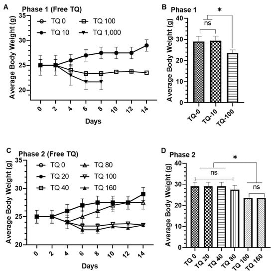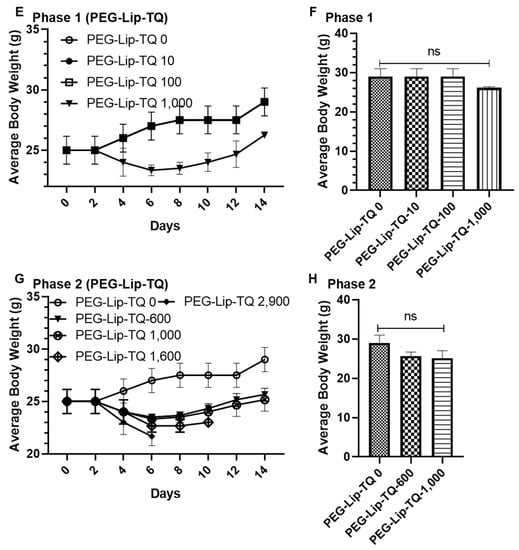 The phase 1 in vivo oral toxicity data showed that 100% and 66% mortality were observed by TQ 100 and TQ 1000, respectively (Table S2). Interestingly, no mortality was found in PEG-Lip-TQ 100, although a 33% mortality was recorded in PEG-Lip-TQ 1000 (Table S4). The doses PEG-Lip-TQ for phase 2 were increased as 600, 1000, 1600, and 2900 mg/kg bw (Table S5), while it was reduced for free TQ as 20, 40, 100, and 160 mg/kg bw (Table S3). The mortality data from both of the phases suggested the IC50 for the free TQ as well as PEG-Lip-TQ as 89.5 and 775 mg/kg b.w, respectively (Tables S2–S5, Figure 8I). Noticeably, a several fold increase (~9) was recorded in the LD50, evidently suggesting the use of PEG-Lip-TQ in the treatment strategy with TQ. In the phase study, no significant change in the body weight was observed in TQ-0 as well as TQ-10, while a significant weight reduction (>20%, p < 0.05) was recorded in TQ-100 (Figure 8A,B). Remarkably, no significant decrease change in the body weight was observed in the animals exposed to varying doses of PEG-Lip-TQ in phase 1 (Figure 8E,F). The phase 2 data showed a significant decrease in the body weight in the animals exposed to TQ 100 and TQ 160, while no significant change in the body weight was observed in TQ 20, TQ 40, as well as TQ 80 (Figure 8C,D). However, no change in the body weight was observed in the surviving animals as 100% was recorded in PEG-Lip-TQ 1600 and PEG-Lip-TQ 2900 animals at 6 and 8 days, respectively, after the start of phase 2 study (Figure 8C,D).