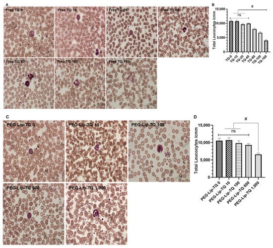 The Leishman staining of the leukocytes in all surviving animals of both phases showed ruptured and degranulation of the cells in the animals treated with TQ-80, TQ, 100, and TQ 160, while vacuolization could also be seen in TQ 160 (Figure 9A). The hematological data revealed a significant decrease in the total leucocytes count in the animals exposed to TQ-80, TQ-100, and TQ-160 in comparison to TQ-0 (Figure 9B). Noticeably, no structural change was observed in the cells exposed to PEG-Lip-TQ doses except PEG-Lip-TQ 1000 as ruptured cells could be seen in it (Figure 9C). The hematological data of total leukocytes also showed the same pattern as a significant reduction was measured only in the animals exposed to PEG-Lip-TQ 1000 (Figure 9D).