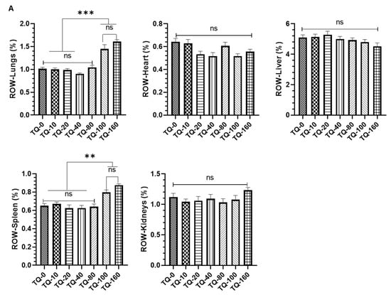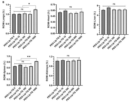 The relative organ weight (ROW) showed significant changes in the lungs and the spleen of the animals exposed to TQ-100 and TQ-160. However, no significant change was observed in the ROW of the heart, liver, and kidneys in any of the treated group of free TQs. As depicted in Figure 10A, a 43% and 58% increase in the ROW were calculated in the lungs of TQ-100 and TQ-160, respectively, clearly indicating the toxicity of TQ in the lungs at these concentrations. The ROW of spleen data showed a 22.5% in TQ-100 and ~35% increase in TQ-160 (Figure 10A), which directed us to make the formulations of TQ to avoid such a type of toxicity, while using it is frequently used in the ailment of several diseases including lung cancer. The ROW results of the surviving animals exposed to PEG-Lip-TQ revealed a 23.76% and 26.5% increase in the ROW of lungs and spleen, respectively, by PEG-Lip-TQ 100, while no change was observed in any of the other doses in the ROW (Figure 10B).