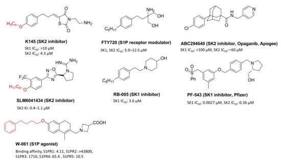 Sphingosine kinase (SK), an evolutionarily conserved lipid kinase, transforms sphingosine into an active lipid mediator sphingosine-1-phosphate (S1P) [1]. S1P regulates various biological processes such as cell proliferation, migration, differentiation, and angiogenesis through five G protein-coupled S1P receptors (S1PR) binding [2]. SK has two isotypes, i.e., SK1 and 2, and is present in specific cellular locations. Both the isotypes have potential oncogenic characteristics [3,4] upon overexpression and promote cancer cell proliferation, angiogenesis, metastasis, and resistance against radiation and various chemotherapeutic agents [5,6]. For this reason, SK1 and 2 serve as novel targets for the development of anticancer agents. Various SK1, SK2, and S1PR inhibitors have been developed and tested in several preclinical tumor models.