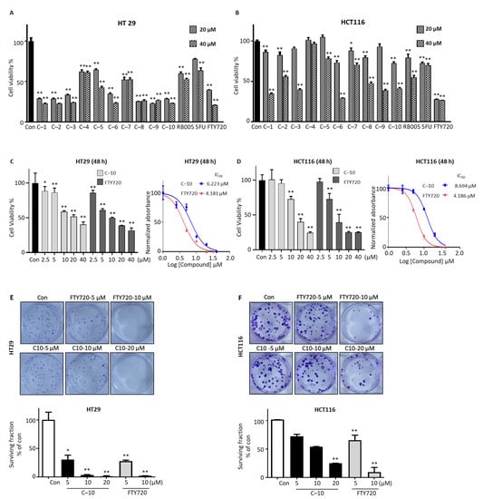 Compound 10 inhibits the growth and proliferation of colorectal cancer cells in vitro. The cell viability of (A) HT29 and (B) HCT116 with treatment of 20 and 40 µM concentration of compounds 1–10 for 24 h was determined by MTT cell viability assay and compared with RB005, 5-FU, and FTY720. Compound 10 was selected, concentration-dependent (2.5–40 µM) cell toxicity effect after 48 h treatment was performed, and IC50 was determined in (C) HT29 and (D) HCT116. Cell proliferation assay was performed after treatment of compound 10 (5 and 10 µM) and FTY720 (5 and 10 µM) in (E) HT29 and (F) HCT116 cells, and the surviving fraction was calculated as described in the method. The results presented are mean ± SD for three individual experiments. * p < 0.05, ** p < 0.01 compared with nontreated control group.
