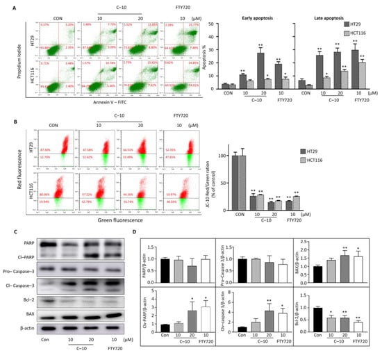 Compound 10 inhibits colorectal cancer through the intrinsic mitochondrial apoptotic pathway. (A) The HT29 and HCT116 cells were treated with the desired concentration of compound 10 and FTY720; cell apoptosis assay was performed by annexin–V assay and presented as early (left) and late (right) apoptosis. (B) Mitochondrial outer membrane potential was determined using JC−10 dye; both the samples were analyzed by flow cytometer. (C) HCT116 cells were treated with compound 10 and FTY720; the protein was extracted, and expression of proteins PARP, cleaved PARP, pro−caspase−3, cleaved caspase−3, Bcl−2, and BAX were determined by western blotting. β−actin was used as the loading control. (D) All the western blotting bands were quantified using Image–J software and expressed as protein/β–actin compared to the nontreated control group. The result is representative of three independent experiments, and data are presented as mean ± SD. * p < 0.05, ** p < 0.01 compared with nontreated control group.