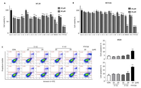 Effect of compounds 11–20 in colorectal cancer cells. Cytotoxicity effect of compounds 11–20 at 10 and 20 µM concentration for 24 h in (A) HT29 and (B) HCT116 cells were determined. (C) HT29 cell apoptosis effect was analyzed by annexin V assay after treatment of compounds 11 and 13 (10 and 20 µM) and FTY720 (10 µM) using flow cytometry. The result is representative of three independent experiments, and data are presented as mean ± SD. * p < 0.05, ** p < 0.01 compared with nontreated control group.