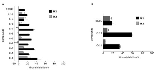 The effect of compounds in sphingosine kinase activity was examined using the AdapdaTM screening system (Thermo Fisher Scientific System, Waltham, MA, USA). The kinase inhibition ability of compounds 1–11 along with RB005 was measured with final concentration of 20 μM. The SK1 enzyme activity assay was performed using 0.04–0.16 ng SK1 enzyme, 50 μM of sphingosine lipid substrate in reaction buffer containing HEPES 32.5 mM (pH 7.5), BRIJ 35 0.005%, MgCl2 5 μM, and 0.5 mM ethylene glycol-bis (β-aminoethyl ether)-N,N,N′,N′-tetraacetic acid (EGTA), whereas 35–140 ng SK2 enzyme along with 50 μM sphingosine lipid substrate was used in 32.5 μM HEPES pH 7.5, 0.5 μM EGTA, 1.5 μM MgCl2 buffer to detect SK2 enzyme activity. The data were presented as percentage inhibition of SK enzyme by individual compounds.