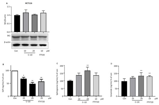 We observed the protein expression levels of SK1 and 2 to determine whether compound 10 could reduce SK activity by reducing the expression of SK1 and 2. The treatment of 10 and 20 µM of compound 10 in HCT116 cells does not affect the SK1 protein expression level compared to control cells, which is similar to the FTY720-treated cells (Figure 6A). Treatment of compound 10 at 10 and 20 µM significantly reduces the S1P levels produced by SK in a concentration-dependent manner compared to nontreated control cells (Figure 6B). In reverse, 10 µM and 20 µM of compound 10 treatment in HCT116 cells increased sphingosine level by 1.42 and 1.74 fold compared to nontreated control cells (Figure 6C). Ceramide level was increased in HCT116 treated with 20 µM of compound 10 (Figure 6D). These results indicate that the SK1 protein expression is not affected by the treatment of compound 10. In contrast, the apoptosis in colon cancer cells by compound 10 could be initiated due to the inhibition of SK1 enzyme activity ensuing a decreased pro-survival S1P lipid mediator level and increased proapoptotic sphingosine and ceramide level within colon cancer cells.