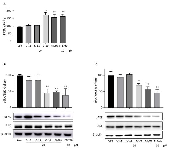 Effect of compound 10 on PP2A activity. (A) HCT116 cells were seeded in 12-well plates and treated with 20 µM of compounds 10, 11, and 13 for 24 h. Cell lysate was performed PP2A activity assay by immunoprecipitation PP2A activity assay kit. HCT116 cells were treated with 20 µM of compounds 10, 11, 13, and RB005 and 10 µM of FTY720. Expression of (B) ERK and pERK and (C) AKT and pAKT was determined and quantified. β-actin was used as the loading control. The result is representative of three independent experiments, and data are presented as mean ± SD. ** p < 0.01 compared with nontreated control group.