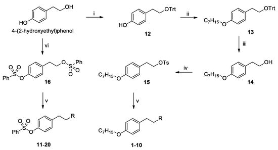 In the synthesis method, 4-(2-hydroxyethyl) phenol was used as a starting material to introduce a triphenylmethyl group, which is a bulky protecting group to synthesize compound 12, and a heptyl group was introduced at the phenol portion using potassium carbonate as a base. The protecting group of compound 13 was removed using HCl, and then tosylation was used to synthesize compound 14. Finally, compounds 1–10 were synthesized by introducing various cyclic amines in compound 15. Compound 16, in which a benzenesulfonyl group was introduced into two hydroxyl groups with a yield of 89%, was synthesized by using three equivalents of benzenesulfonyl chloride at the same starting material to introduce a tail group similar to PF-543. Using compound 16, cyclic amines were introduced in the same manner as for compounds 1–10 to obtain compounds 11–20 by a simple synthesis method (Scheme 1, Table 2).