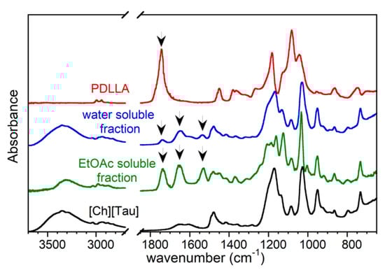 At the end of the reaction, the recovered products were soluble in EtOAc or in water. The ATR-FTIR spectra of the two fractions are displayed in Figure 2. For the sake of comparison, the spectra of the virgin amorphous PDLLA and [Ch][Tau] are also reported.