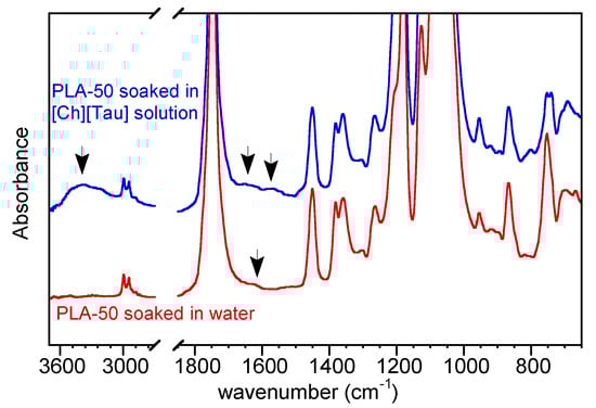 FTIR spectra of PLA-50 soaked in water and in [Ch][Tau] water solution for 10 min at 70 °C. The arrow at 1620 cm−1 indicates the carboxylic C=O stretching absorption of the sample soaked in water due to a light hydrolysis reaction. The arrows at 1650 and 1550 cm−1 indicate the two bands of amide I and II and, at 3400 cm−1, the absorption of N-H and O-H stretching of the sample soaked in [Ch][Tau] solution.