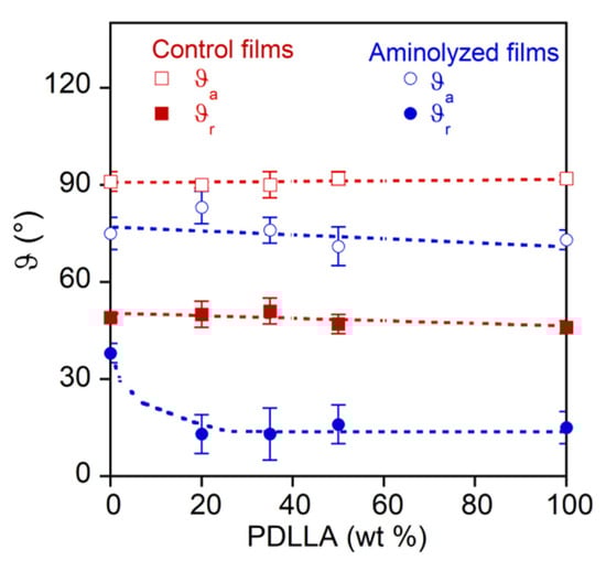 In Figure 4, the receding (ϑr) and advancing (ϑa) contact angle of the polymer films before and after the aminolysis reaction are reported as a function of the PDLLA weight fraction.