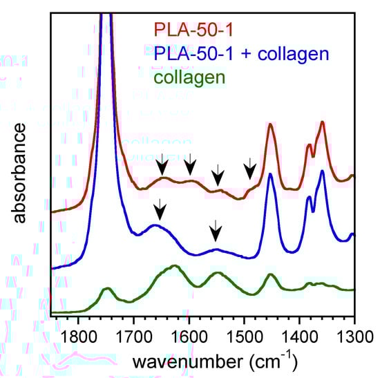 The scaffolds were characterized by ATR-FTIR analysis before and after the absorption of collagen. As an example, the FTIR spectra of the PLA-50-1 scaffold and of the protein are reported in Figure 5.